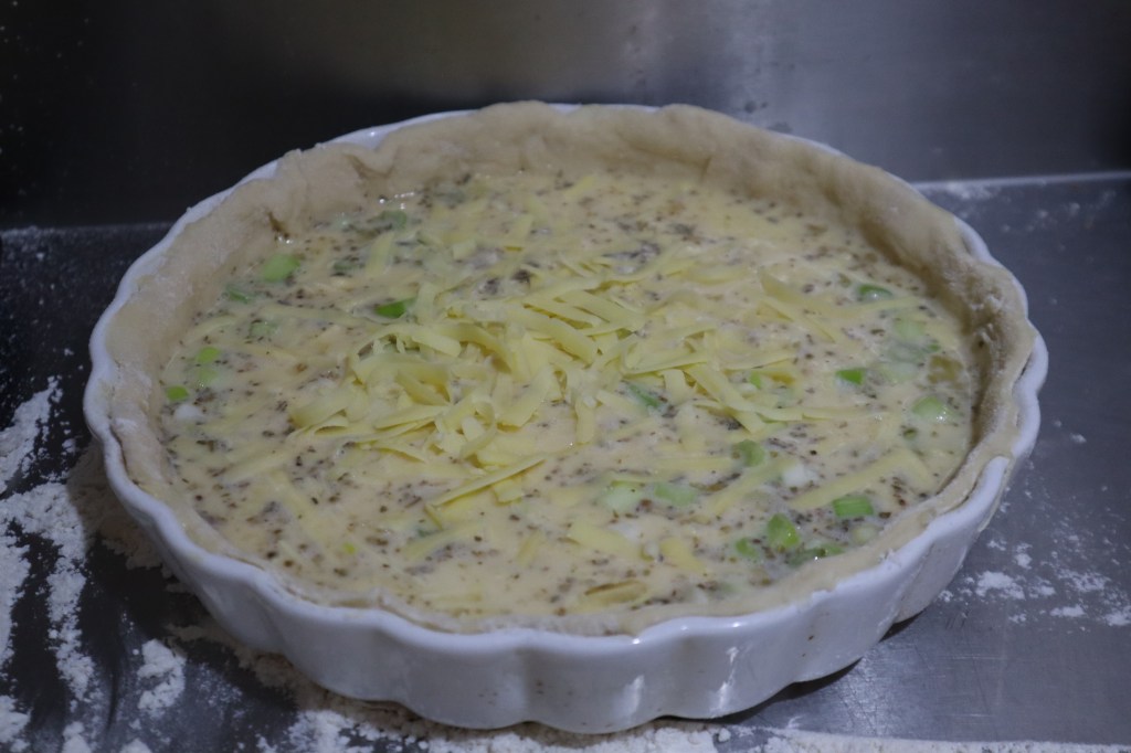Whip up the eggs, add the rest of the ingredients, and whip till combined. Pour mixture onto the dough in the tin ready for baking. Bake for 25-45 minutes, depending on your oven, keep an eye on the quiche, and cook until golden brown.